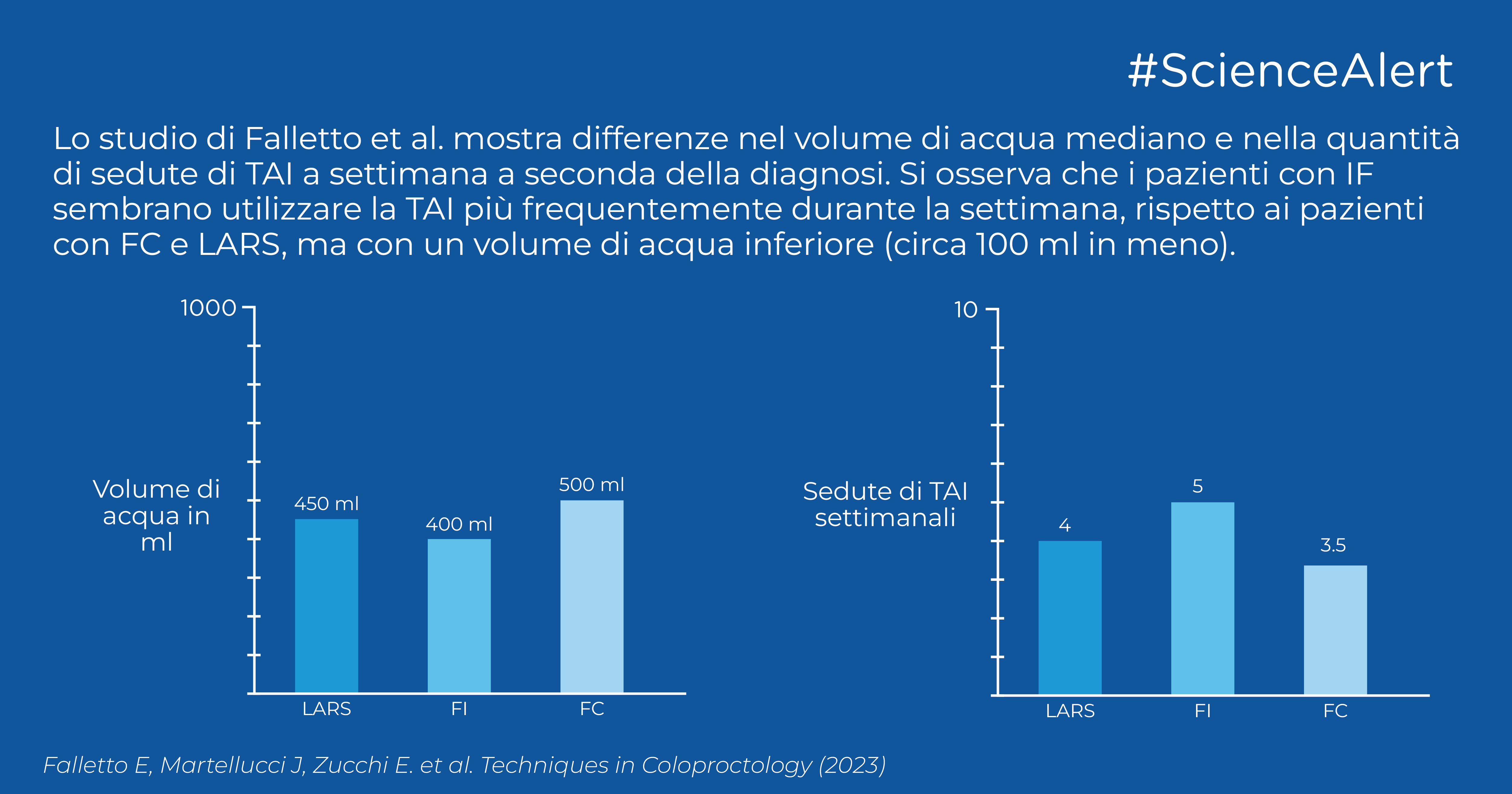 Secondo i risultati di questo studio, si osserva che i pazienti con FI sembrano utilizzare la TAI più frequentemente durante la settimana, rispetto ai pazienti con FC e LARS, ma con un volume d'acqua inferiore (circa 100 ml in meno). Il volume mediano di acqua per i pazienti con LARS è stato osservato essere di 450 ml e la frequenza mediana per la quantità di trattamenti TAI eseguiti a settimana è di 4. Questo è in linea anche con la letteratura precedente. Per i pazienti con FI e FC, la frequenza TAI è risultata rispettivamente di 5 e 3,5, in linea con la letteratura precedente. I volumi mediani di acqua per FI e FC erano rispettivamente di 400 ml e 500 ml, che è leggermente inferiore rispetto agli studi precedenti.