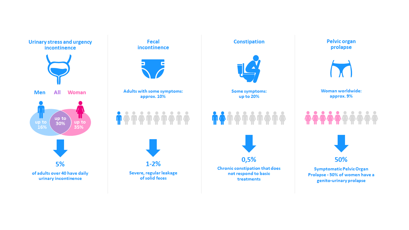 L'impatto delle gravi condizioni del pavimento pelvico sulla qualità della vita è enorme e i pazienti possono soffrire anche per un decennio prima di raggiungere l'operatore sanitario giusto per trattare la loro condizione in modo appropriato. Gli studi dimostrano che circa il 40% riferisce ansia e il 20% anche depressione, a causa dei sintomi causati dalla disfunzione del pavimento pelvico. Ulteriori studi hanno dichiarato l'impatto negativo sul lavoro, dove il 33% delle donne ha riferito che l'incontinenza urinaria ha influenzato la loro concentrazione e capacità di completare le attività senza interruzioni.